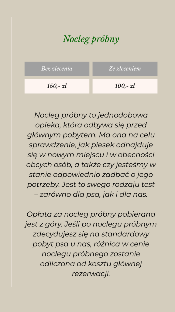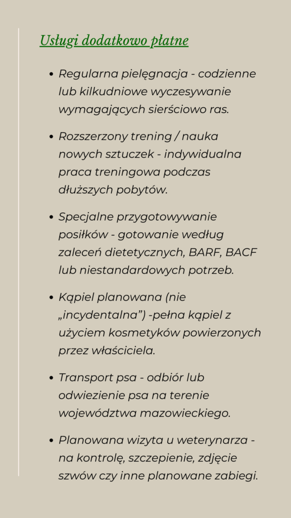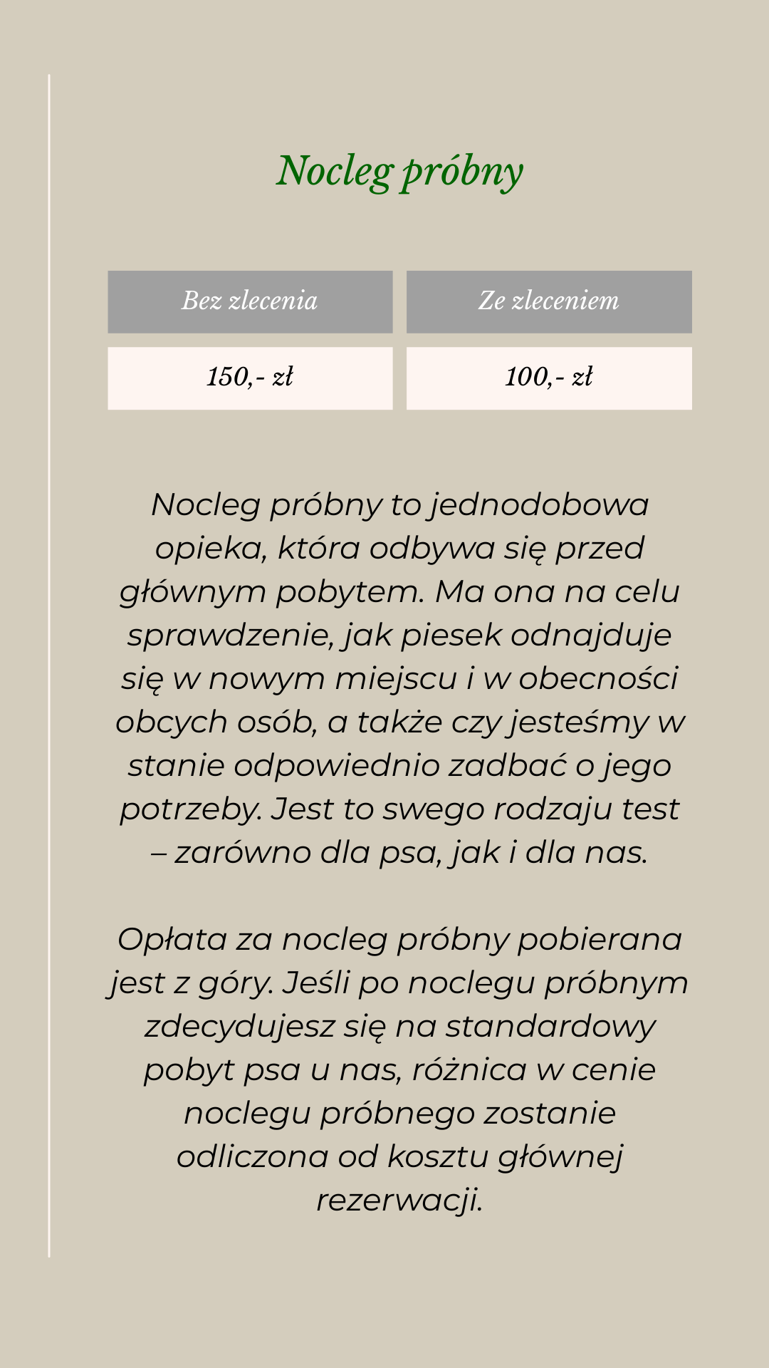 Przedłużenie doby lub zmiana godzin przywiezienia/odbioru psa są możliwe wyłącznie w przypadku braku innej rezerwacji przed/po i wymaga wcześniejszego ustalenia.